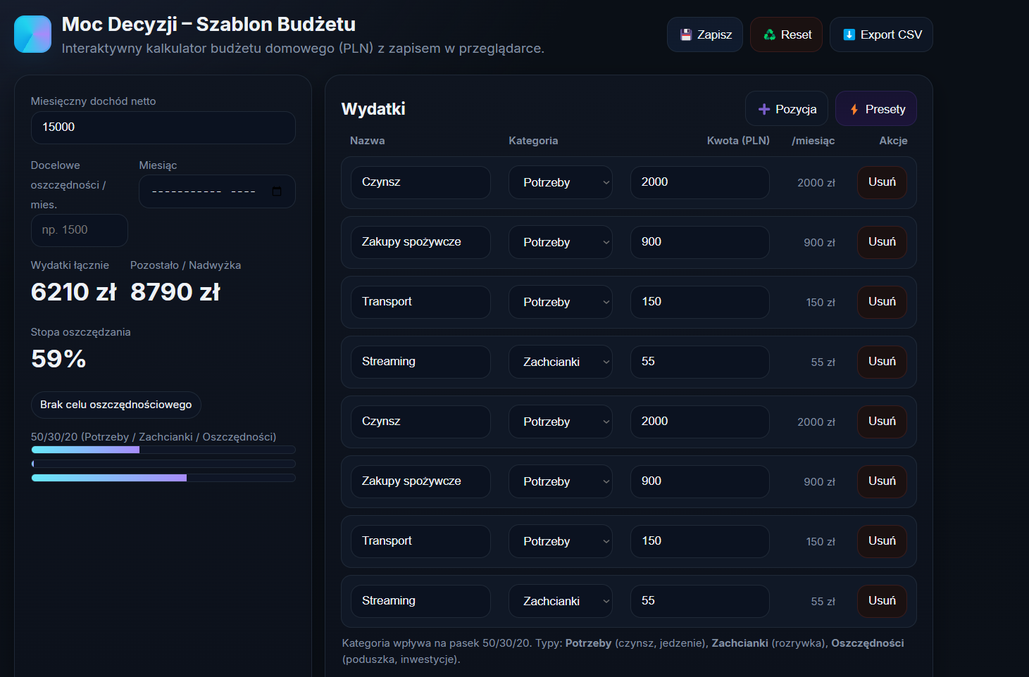 Nasz interaktywny szablon budżetu domowego „Moc Decyzji” to prosty, szybki i nowoczesny sposób na kontrolę wydatków – wszystko w przeglądarce, bez instalowania dodatkowych programów.